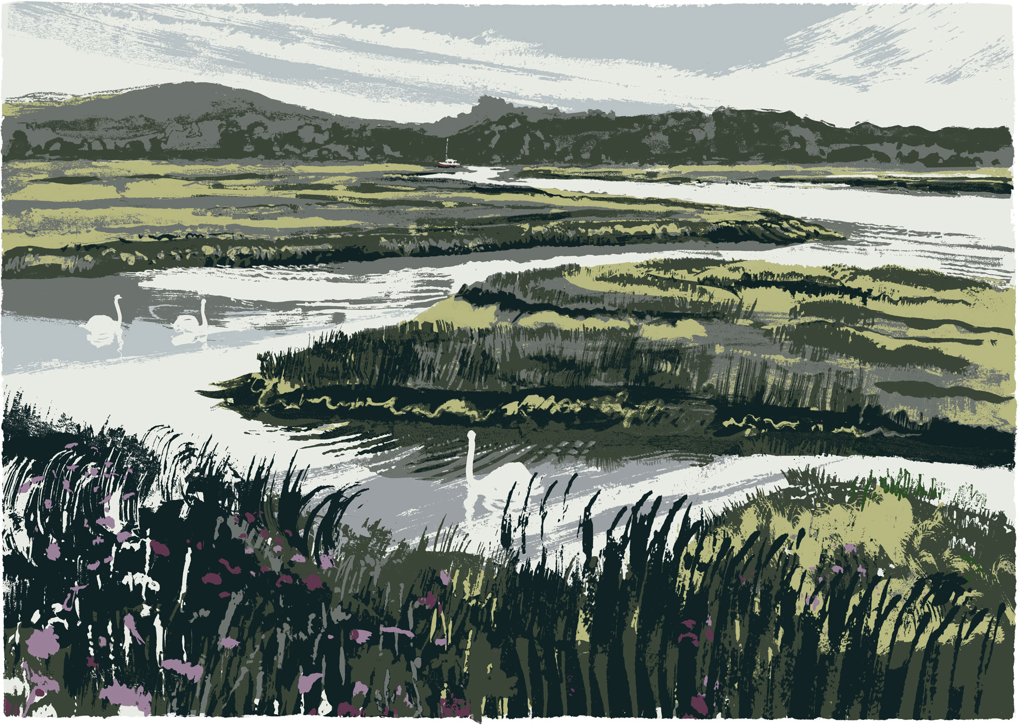 Swans Incoming Tide Swans Incoming Tide ▻Swans Incoming Tide ▻ size ▻ silkscreen ▻ edition 75 ▻ price £290 UF ▻ paper – Saunders Waterford 365gsm ▻image size 630mm x 440mm buy this print back to portfolio